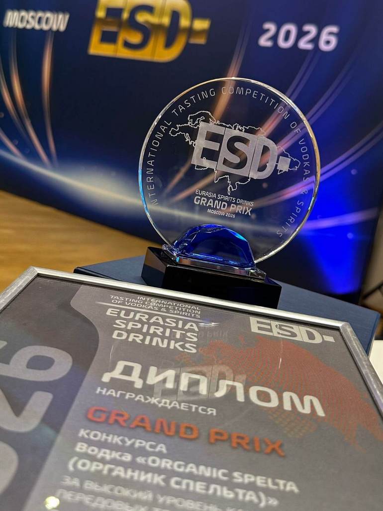 Органическая водка «Органик Спельта» признана лучшей в четырёх номинациях: «Лучшая премиальная водка 2026», Eco-style, New-technology, «Выбор торговых сетей» и отмечена «золотом» и Гран-при.